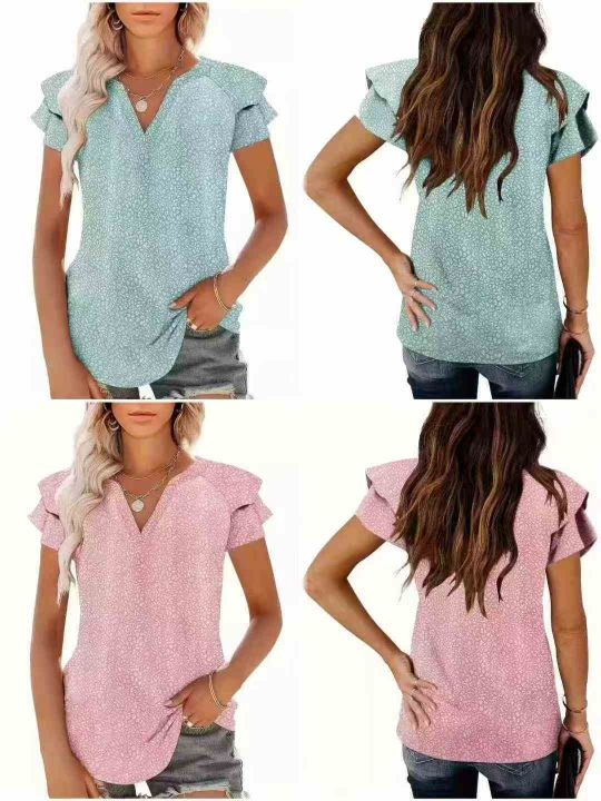 其他/其他 [爆竹][爆竹]3.9清700件欧美时尚休闲V领印花荷叶边袖口短袖,整款,花型图...